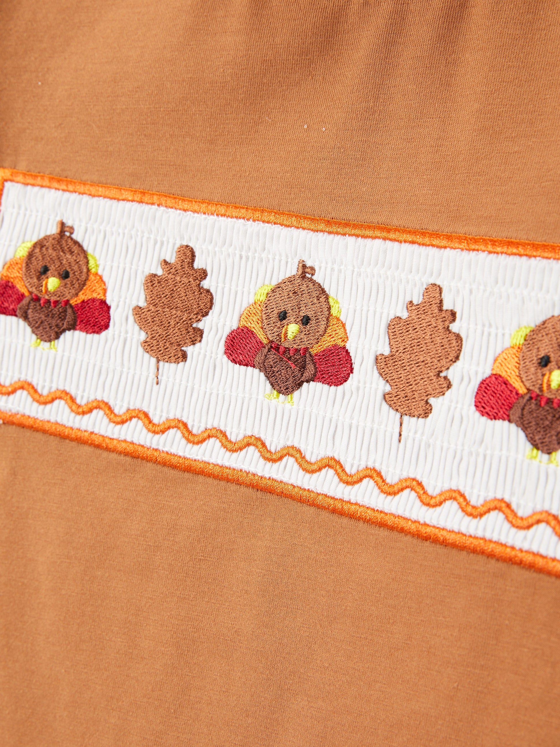 Dress your little man in style this Thanksgiving with our Boys Thanksgiving Smocking Embroidered Brown Plaid Outfit Set. The smocked embroidery adds a touch of charm to the classic plaid design. Perfect for family gatherings and photos, this set will keep your little one looking sharp and comfortable all day long.