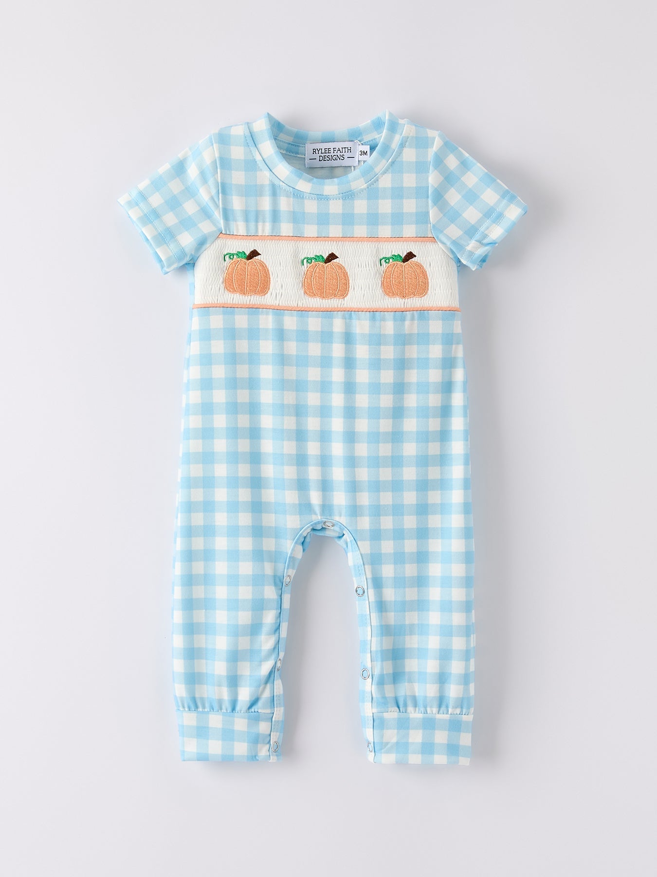 Fall Halloween & Thanksgiving Boys Pumpkin Embroidery Smocking Blue Plaid Romper