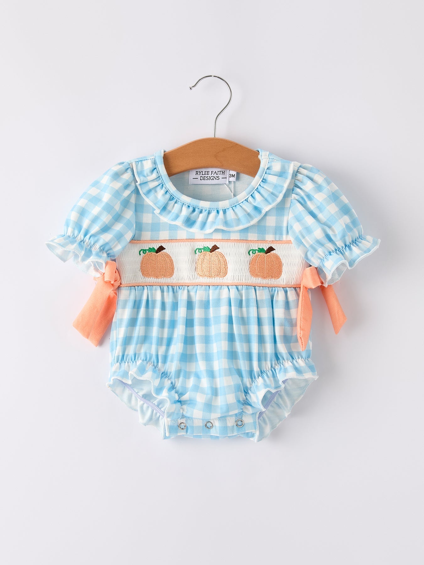 Fall Halloween & Thanksgiving Pumpkin Embroidery Smocking Blue Plaid Romper