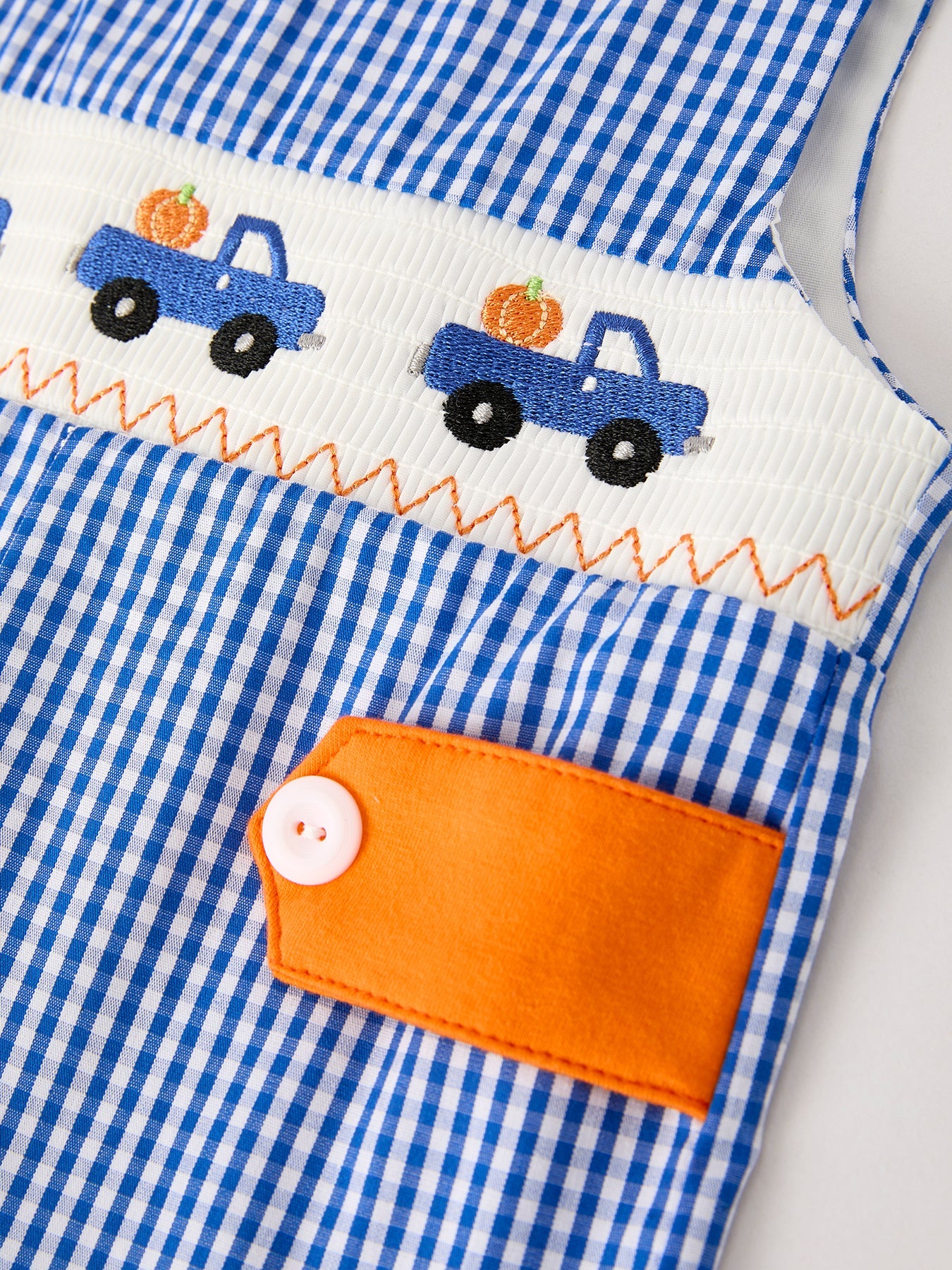 Celebrate the season in style with this adorable Fall Thanksgiving & Halloween Truck Smock Embroidery Baby Boy Romper. Crafted for comfort and festive charm, it features a cute truck embroidery perfect for autumn celebrations. Soft, breathable fabric ensures your little one stays cozy during holiday gatherings, while the smock design offers easy dressing and a playful look. Make your baby’s fall wardrobe both practical and delightful with this charming romper.