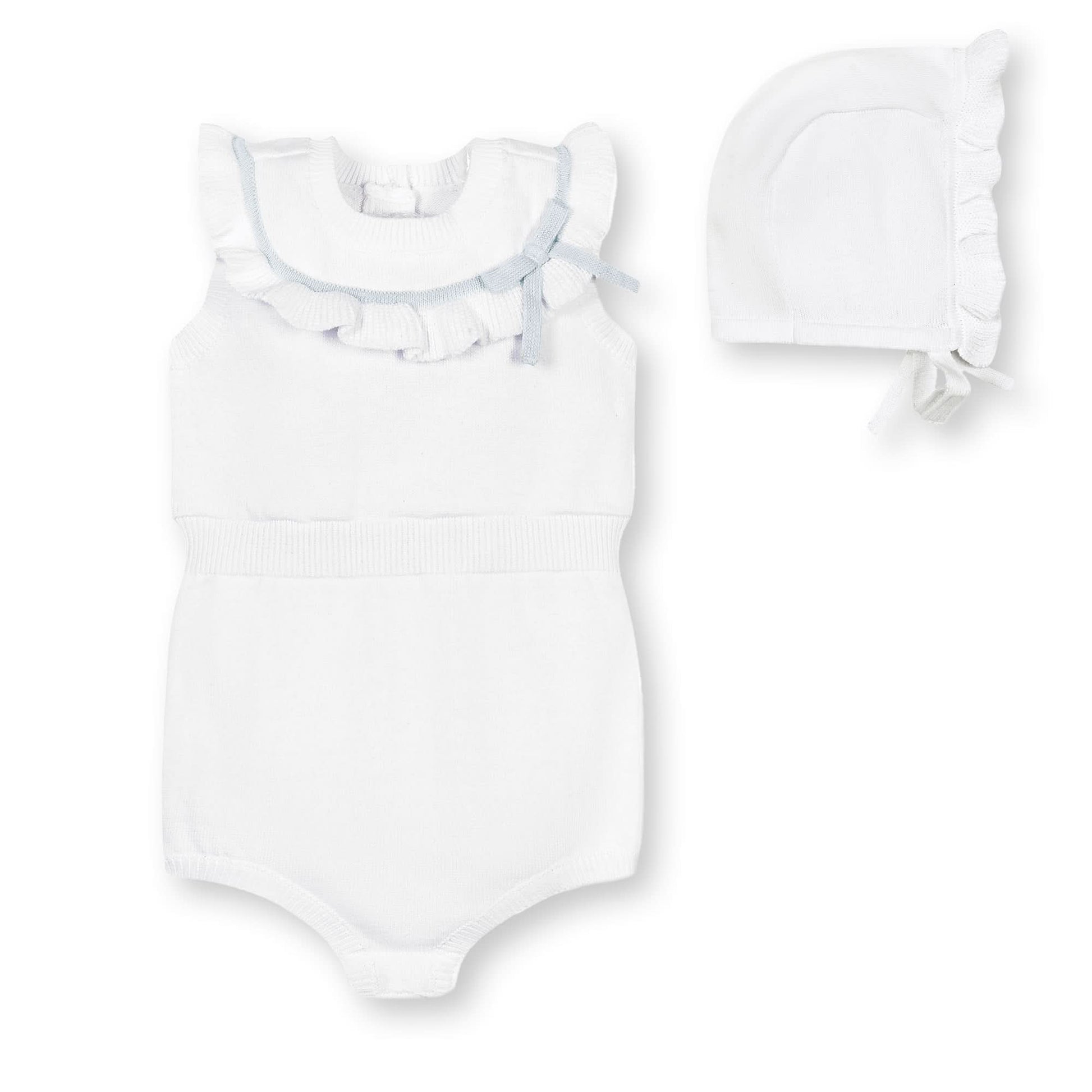 It doesn't get sweeter than our coordinating ruffle sweater set in soft organic cotton for baby. Features a cozy sleeveless romper with a ruffle collar and bow detail, rib waistband, and button closure at the back neck and crotch for easy dressing. A matching face-framing ruffle edge sweater bonnet completes the look. The ultimate aww-worthy gift!