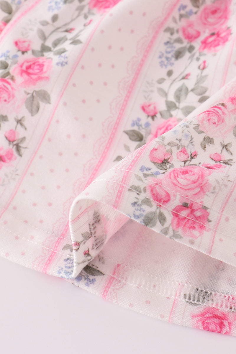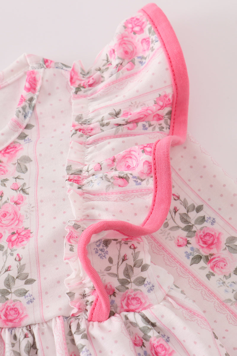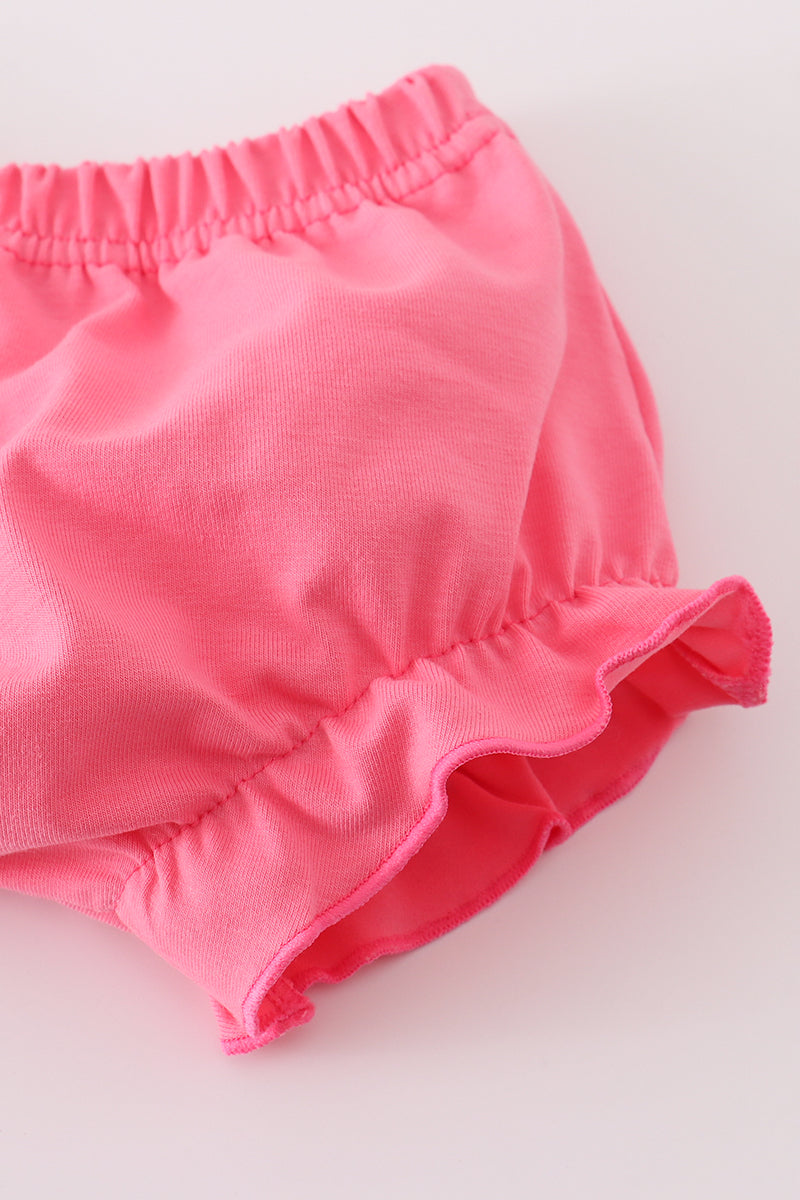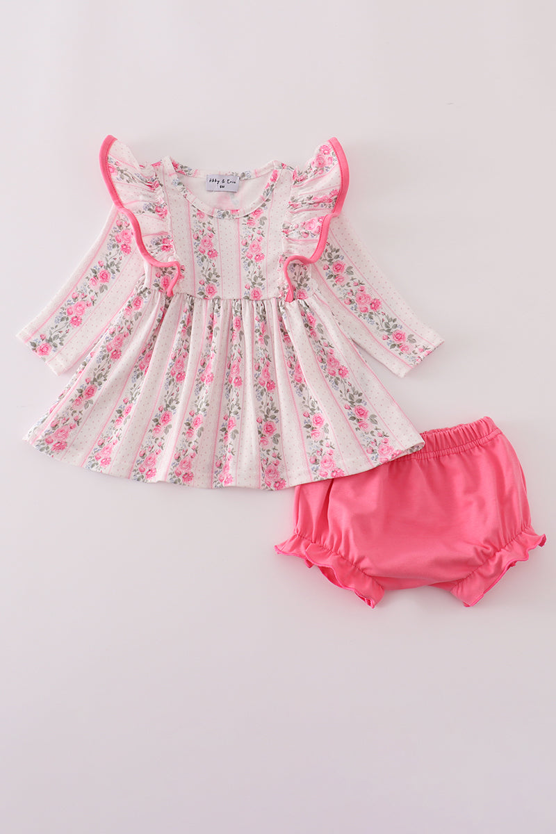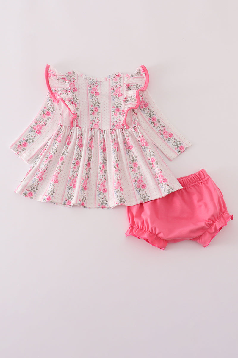 This pink floral print ruffle bloomer set brings a playful touch to any little one's wardrobe. Featuring charming ruffles and a vibrant floral pattern, it’s perfect for sunny days and fun adventures. Soft and comfortable, this set lets your child move freely while looking absolutely adorable.