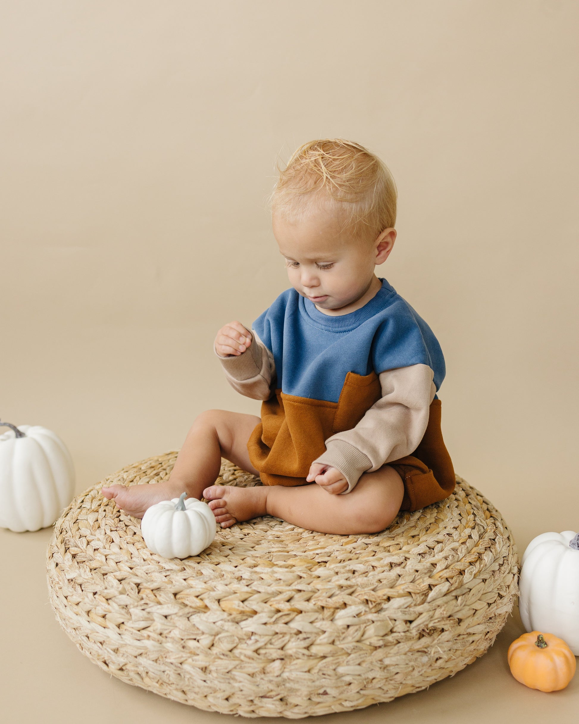 Color Block Oversized Sweatshirt Romper - Embrace autumn vibes with this cozy and stylish oversized sweatshirt romper. Featuring a convenient snap closure at the crotch, it guarantees easy dressing and diaper changes. The charming fall themed color blocking design ensuring a solid style for boys and girls this fall!