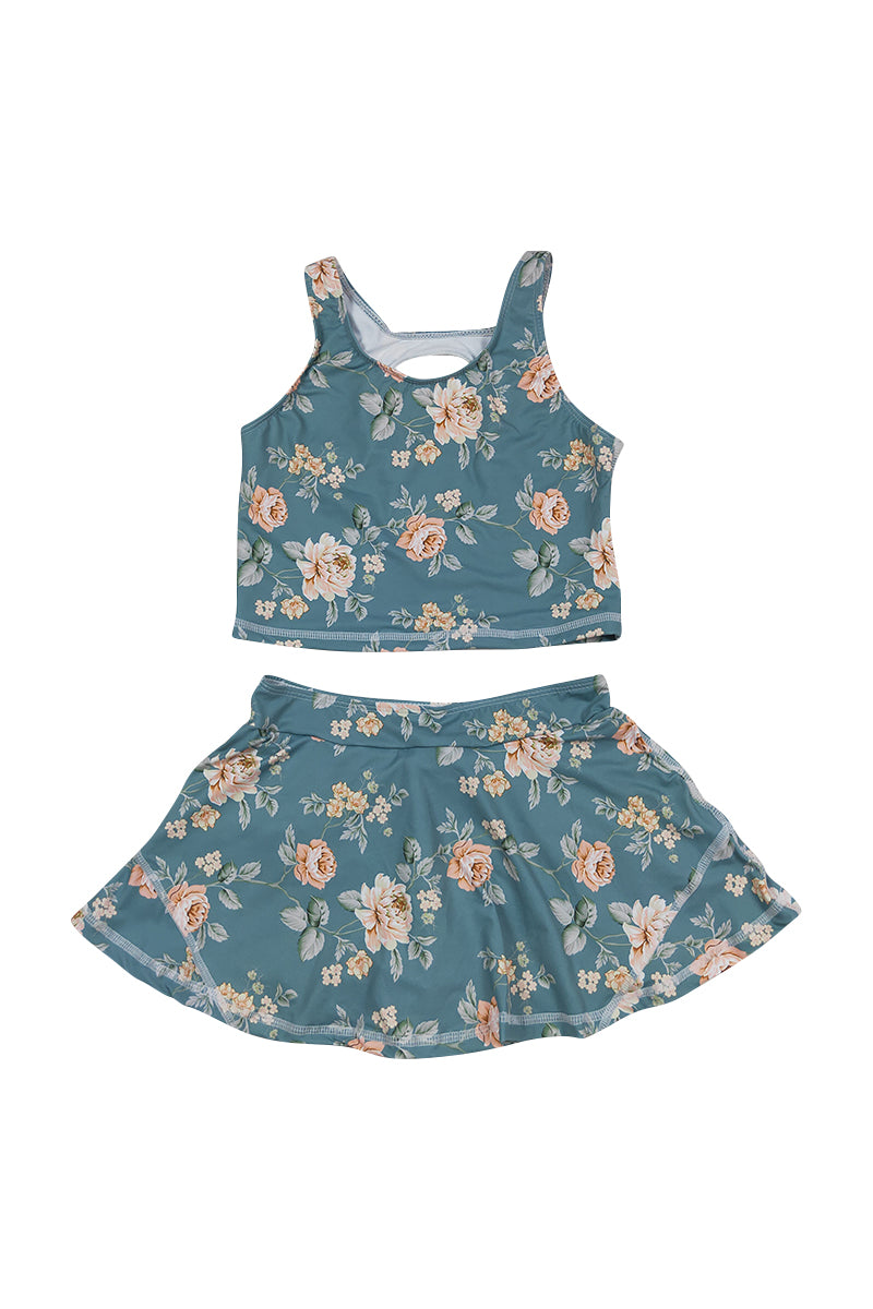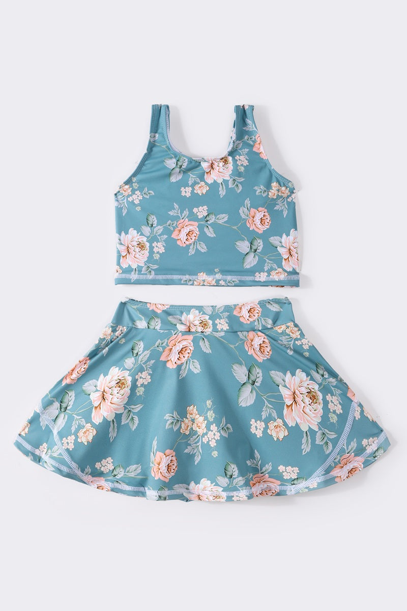 Teal floral print girl 2pc swimsuit